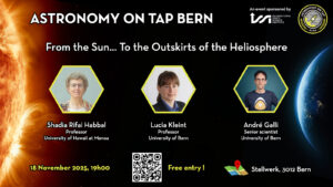 - Tuesday at 7pm: You are all welcone to attend the yearly Astronomy on Tap event. This public outreach event will feature three 15′ talks on heliospheric science, among which one by Shadia Habbal and one by Lucia Kleint. The event starts at 7pm and ends around 9pm; of course, beer will be served. The event takes place at the Stellwerk Bern café, which is next to the elevator leading from the university terrace to the railway station.